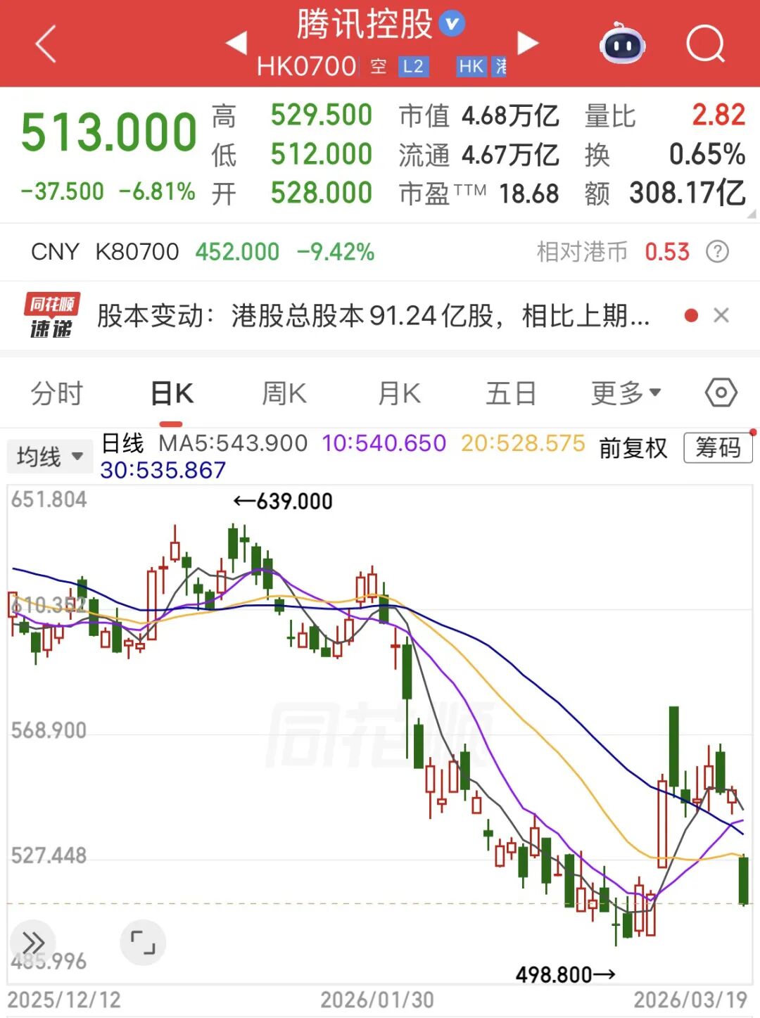3月19日,腾讯港股开盘大跌5%,最终收跌6.81%,每股报513港元,总市值跌破5万亿至4.67万亿港元,一天缩水约3400亿港元。