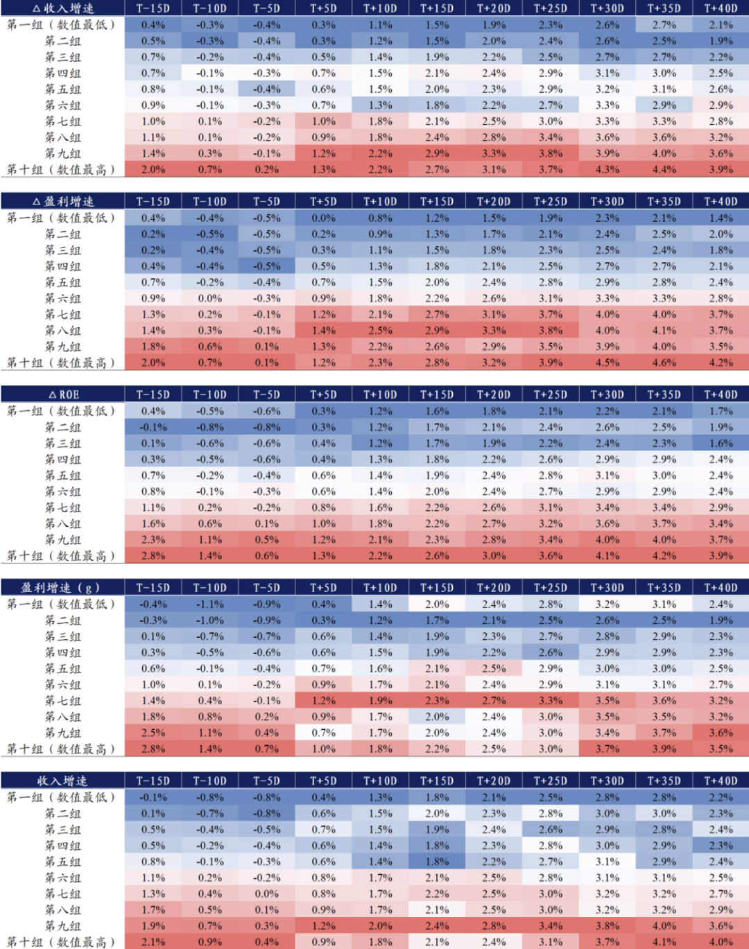 资料来源:开源证券研究所短期视角,景气投资更需关注“增长的边际变化”。财报披露后对股价指引最强的指标是增长的边际变化(Δ类指标),其有效性排序为:Δ利润增速>Δ收入增速>ΔROE。我们的理解,景气投资的目的不是投资现在,而是投资未来,而“现在的高增速不一定代表未来的高增速”,但“现在的高△更容易代表未来的高增速”。