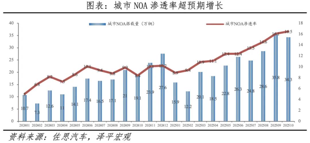 一个很直观的数据:中汽协发布的报告显示,2025年1-11月,国内搭载城市NOA的乘用车累计销量312.9万辆,渗透率只有15.1%;而国金证券的研报预测,到2026年,这个数字会涨到545万台,渗透率直接飙升到25%。