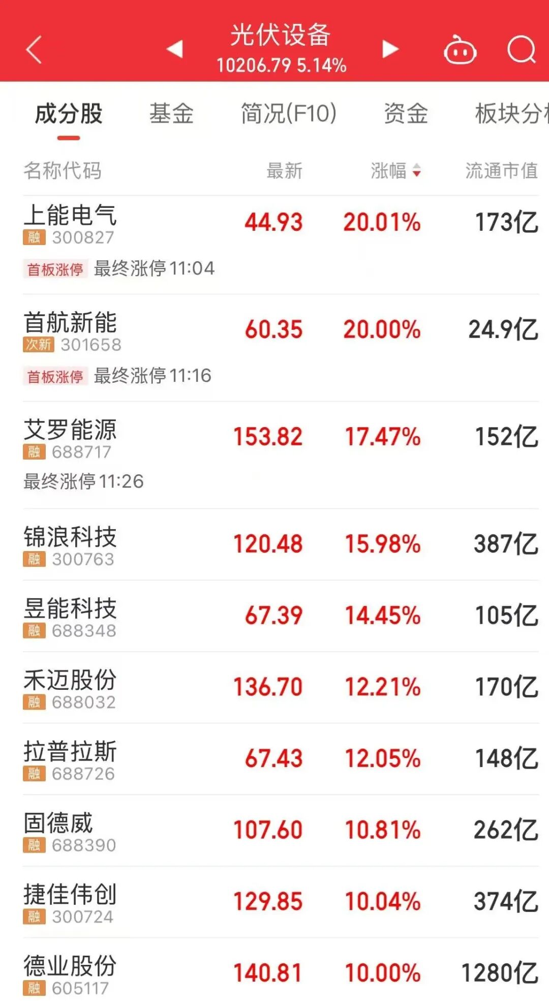 受此消息催动,光伏概念股爆发,上能电气20cm涨停,首航新能涨逾19%,九洲集团、艾罗能源涨逾15%,锦浪科技、昱能科技涨逾14%。港股光伏太阳能板块同步走强,钧达股份拉升涨超10%,信义光能涨超6%,福莱特玻璃涨超4%。