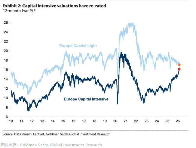 高盛在关于 HALO 资产的研究报告里,以欧洲市场做了举例:过去享有估值溢价的轻资产组合正出现回调,而长期估值受压的重资产组合则持续走强。尤其在近几年,两者之间的估值差距迅速收窄。