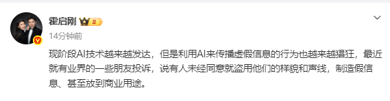 3月23日,霍启刚在个人社交账号上发文,称自己的形象遭到AI盗用。