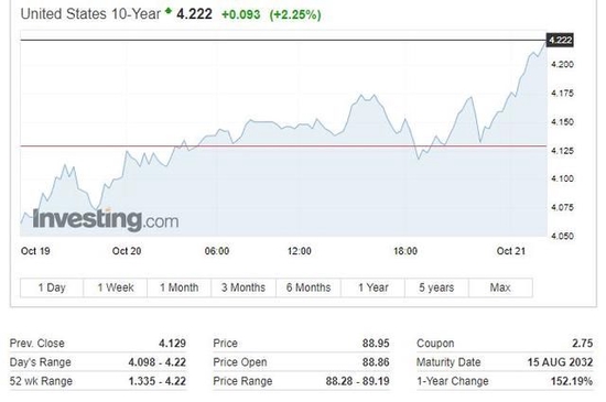 10月20日周四,多位美联储高官再发激进加息的鹰派言论,10年期美债收益率应声涨幅扩大至日高,并自2008年6月以来首次涨穿4.20%关口,美股集体由涨转跌。