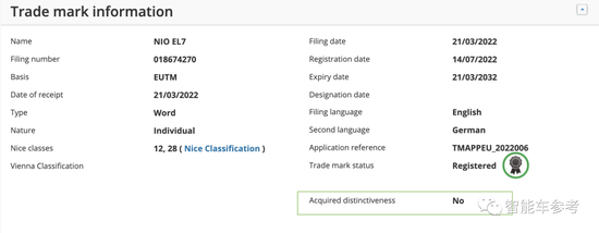 值得一提的是,在欧盟知识产权局的网站上,蔚来EL7的商标名称还是被认定为没有独立的辨识度。