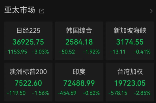 19日,亚太股市低开低走。截至发稿,日经225指数跌幅扩大至3%,最低报36925.75点。台湾证交所加权股价指数下跌近3%至19723.05点。韩国综合指数跌1.92%,澳洲标普200指数跌1.56%。