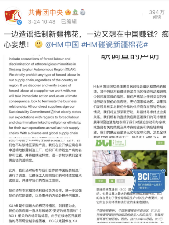 人民日报、共青团中央等官方大V先后向H&M发起声讨浪潮,反对抹黑造谣,支持新疆棉花。