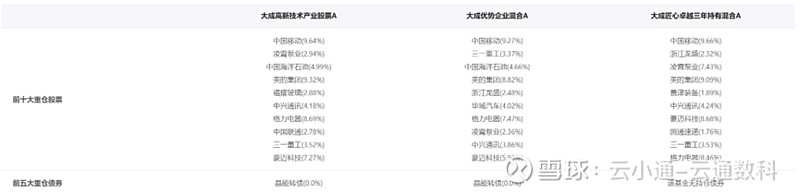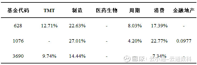 下表展示了云通数科公募基金数据库中,三只基金在申万一级行业板块各自的配置比例。