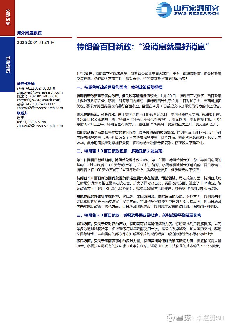 特朗普新政聚焦于国内政策,但关税不确定性仍较大。1月20日,特朗普正式就职,首日政策主要涉及边境安全、移民、能源等国内问题。但特朗普计划于2月1日对加拿大、墨西哥加征关税,要求对美国贸易政策进行全面审查,且需在4月1日前提交不公平贸易行为的审查报告。