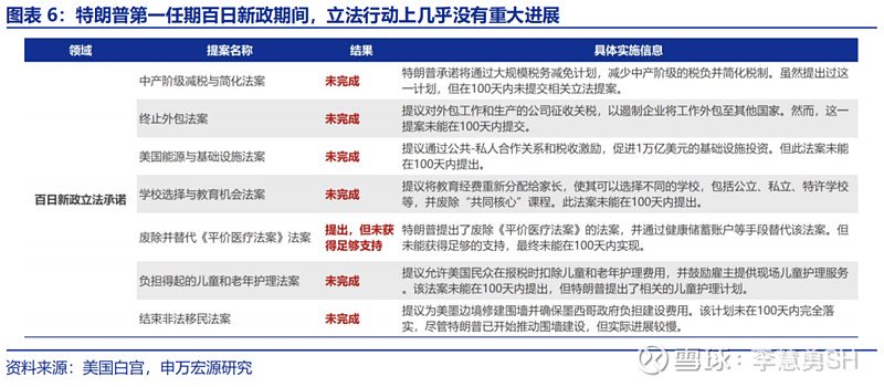 未能兑现的领域集中在医疗、移民等,主因为法院、国会层面的反对,在立法上几乎没有取得重大进展。医疗方面,特朗普承诺在上任 100 天内推动通过废除和取代奥巴马医改法案,但以失败告终,共和党内部分歧及民主党反对导致医疗改革难以推进。贸易方面,特朗普上任前曾提出将中国列为货币操纵国,但在上任后的100天内未实施此政策;特朗普公开表示要重新谈判北美自贸协定,但百日内未能启动正式NAFTA的谈判。减税方面,特朗普计划在100天内通过减税法案,在百日新政临近结束,才公布税改计划,法案通过时间则更晚。移民方面,虽然签署了旅行禁令和难民禁令,但引发了广泛的争议和法律挑战,受阻于联邦法院;由于预算谈判,美墨边境墙的资金被延迟,建墙进程缓慢;驱逐移民的实际进展较为缓慢。