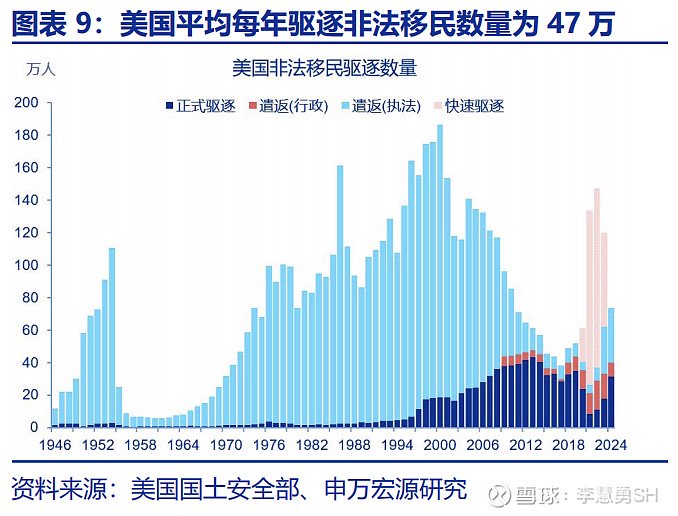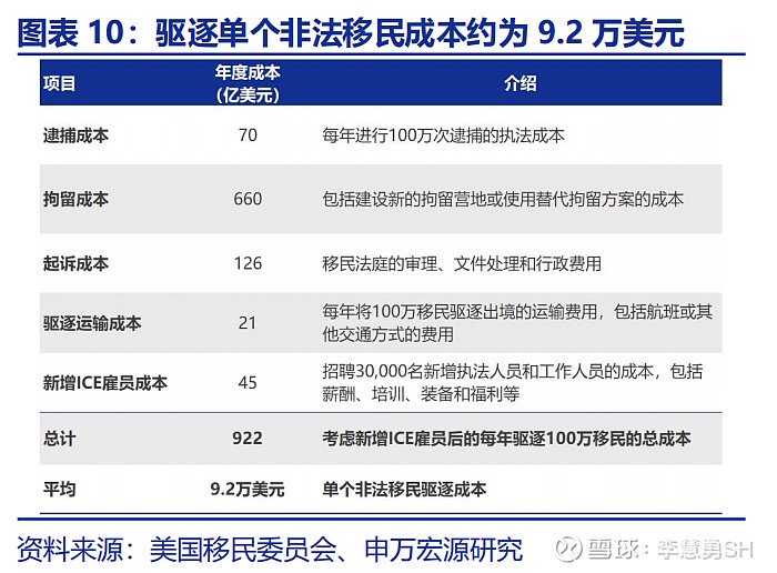 移民方面,受制于事前及事中的反对力量,特朗普或降低非法移民驱逐力度。驱逐移民需大量资金,移民执法局现有的执法能力或难以应对。驱逐100万非法移民的成本约为922亿美元,2025年,移民局的年度预算仅约97亿美元,扩大预算需要民主党及共和党保守派的配合。