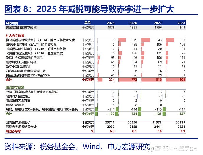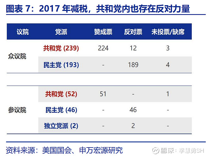 减税方面,事前约束较大,特朗普或将面临民主党集体抵制及共和党保守派的反对,或不得不降低减税幅度。在减税立法过程中,虽然共和党可以利用预算调解程序绕过参议院的阻挠议事,以简单多数通过与法案,但这一程序的使用次数有限,每财年只能使用一次。若减税与其他优先政策(如增加国防开支或移民改革)冲突,使用预算调和的机会可能被占用。2025年特朗普或需综合考虑减税、债务上限、政府关门、年度预算的分歧。考虑到29名共和党保守派可能要求将减税与削减支出挂钩,以确保预算平衡,特朗普2018年的妥协或不得不重演,以降低减税幅度为代价推动法案的通过。