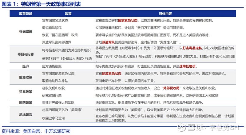 上任第一天,特朗普颁布多项行政命令,聚焦于移民、能源等问题,威胁对加拿大、墨西哥加征关税。美国时间1月20日,特朗普正式宣誓就职第47任美国总统,签署多项行政命令,主要涉及边境、移民、能源和联邦雇员领域,并未涉及关税加征。移民方面,特朗普计划宣布南部边界的国家紧急状态,派遣军队到南部边界,以应对“灾难性入侵”,将立即驱逐非法移民,遣返“数百万犯罪移民”,恢复“留在墨西哥”政策。社会治安方面,将毒品走私集团列为外国恐怖组织,旨在打击毒品走私集团的运作,将依据1798年《外国敌人法》指示政府,利用联邦和州执法机构的力量,打击所有外国和犯罪网络。经济方面,将指示内阁成员利用所有资源,打击创纪录的通货膨胀,并迅速降低物价;能源方面,将宣布国家能源紧急状态,加强国内能源生产来应对能源危机,特别是石油和天然气的生产,取消拜登政府的汽车排放法规;关税方面,将对外国征收关税和税收来增加收入,设立“外部税收局”。特朗普计划于2月1日对加拿大、墨西哥加征关税,要求对美国贸易政策进行全面审查,且需在4月1日前提交不公平贸易行为的审查报告;国防方面,重建世界最强大的军队,不仅通过赢得战斗来衡量成功,还要通过结束战争和避免战争来评估成绩;地缘政治领域,将墨西哥湾更名为“美国湾”,收回巴拿马运河。