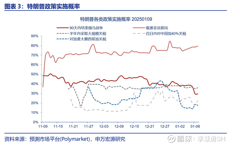 特朗普调整了政策的优先级,延长了解决俄乌冲突的时间限制,涉华表态较复杂。特朗普原计划上任后24小时内解决俄乌冲突,当前已表态延长为6个月内解决俄乌冲突;对华方面,特朗普有意在就职100天内访华,虽未明确提出对华加征关税,但释放的关税信号仍复杂,存在较大不确定性;特朗普在移民问题上,表态有所加强。参考Polymarket的市场预期政策执行概率,特朗普驱逐非法移民的概率较高,但特朗普上任后采取大规模贸易战的概率不及50%。