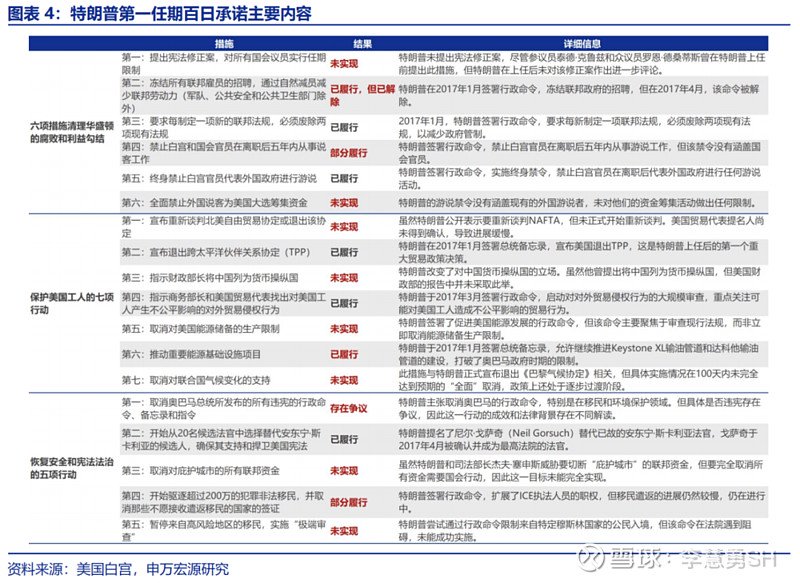 特朗普1.0百日新政期间兑现的承诺主要集中在能源、司法领域。司法政策方面,特朗普成功任命尼尔·戈萨奇担任最高法院法官。扩大了保守派占比。贸易政策方面,退出了TPP协定。能源政策方面,退出《巴黎气候协定》,批准三条输油管道建设,撤销奥巴马时代的环境政策。