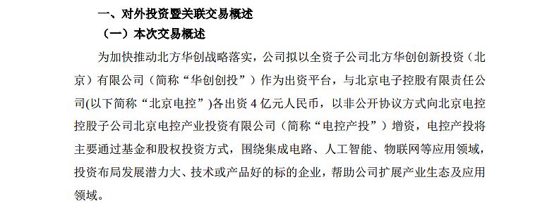 4月18日,北方华创公告,公司拟以全资子公司北方华创创新投资(北京)有限公司作为出资平台,与北京电子控股有限责任公司(以下简称“北京电控”)各出资4亿元人民币,以非公开协议方式向北京电控控股子公司北京电控产业投资有限公司增资。