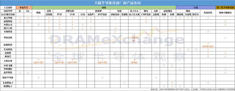 由上表可知,在中国大陆,我国目前在发展平台型设备厂商方面卓有成效的主要有北方华创、中微公司、盛美上海和万业企业,而在各细分领域也出现了诸如拓荆科技、芯源微、华海清科、长川科技、精测电子、中科飞测等代表性企业。