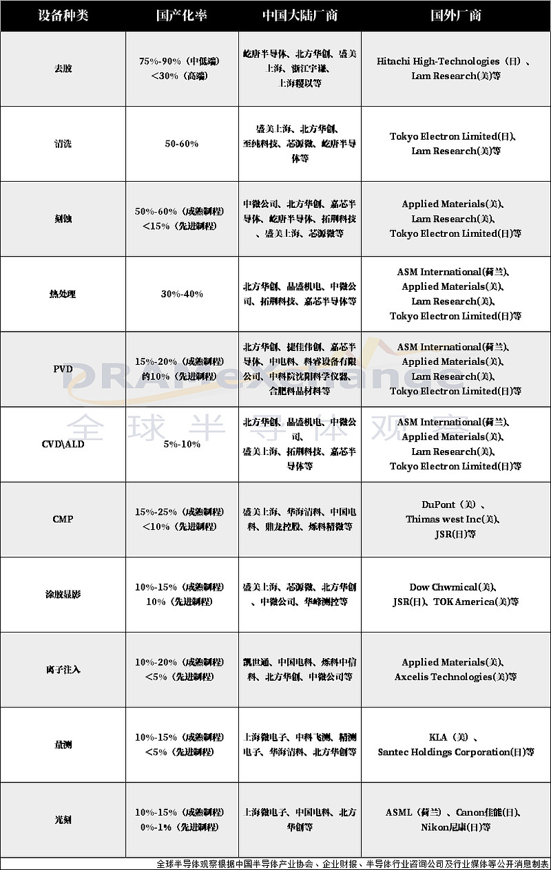 PVD设备领域则是北方华创、捷佳伟创、嘉芯半导体、中电科、科睿设备有限公司、中科院沈阳科学仪器、合肥科晶材料、晶盛机电、中微公司、盛美上海、拓荆科技。该领域设备国产化率还处于较低水平,约为15%-20%,其中在先进制程领域,国产化率仅为10%左右,主要依赖进口。