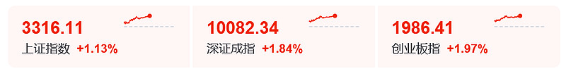 截至收盘,沪指涨1.13%报3316.11点,深证成指涨1.84%报10082.33点,创业板指涨1.97%报1986.41点,北证50指数涨3.21%,沪深北三市合计成交13646亿元。