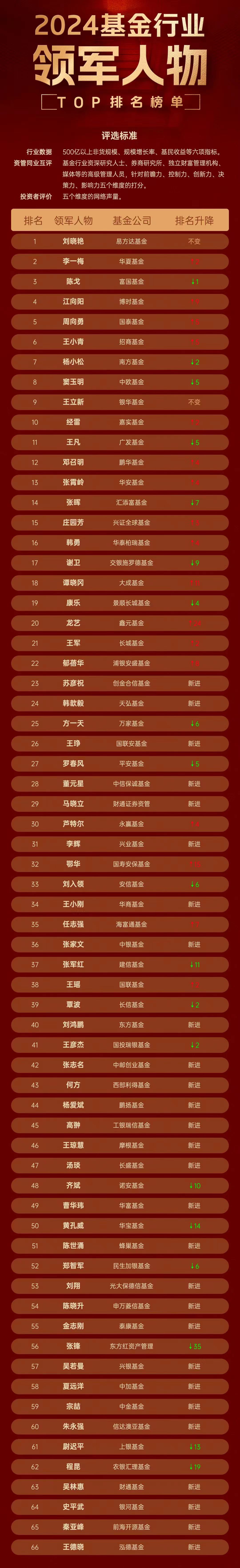 2024公募基金领军人物:易方达刘晓艳、华夏李一梅、富国陈戈居前三,博时江向阳、中欧窦玉明等上榜(全名单)