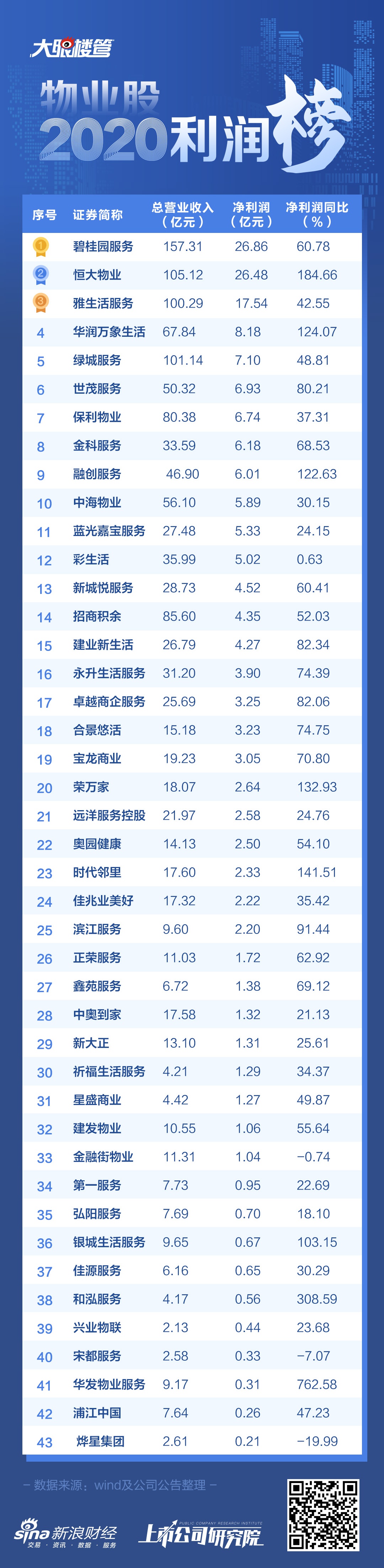 随着上市公司年报披露,目前A+H股中42家物业股已经发布2020年业绩公告。各项数据显示,2020年物业管理行业仍然是高速发展的阶段。碧桂园服务以157.31亿元营收、26.86亿元净利润排第一,分别同比增长63%、61%,其次是恒大物业以105亿营收、26.84亿元净利润排第二。