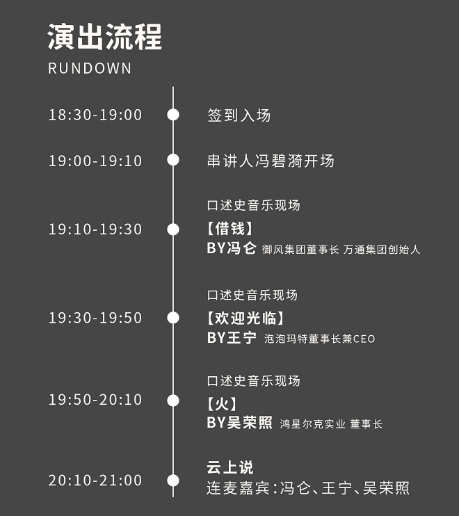 1月8日,冯仑风马牛年终秀开讲。这场名为“B面故事”的现场演出,将以“口述史+音乐live”的独特形式,为你呈现冯仑、王宁(泡泡玛特董事长兼CEO)、吴荣照(鸿星尔克实业董事长)三位创业者的三段人生经历。