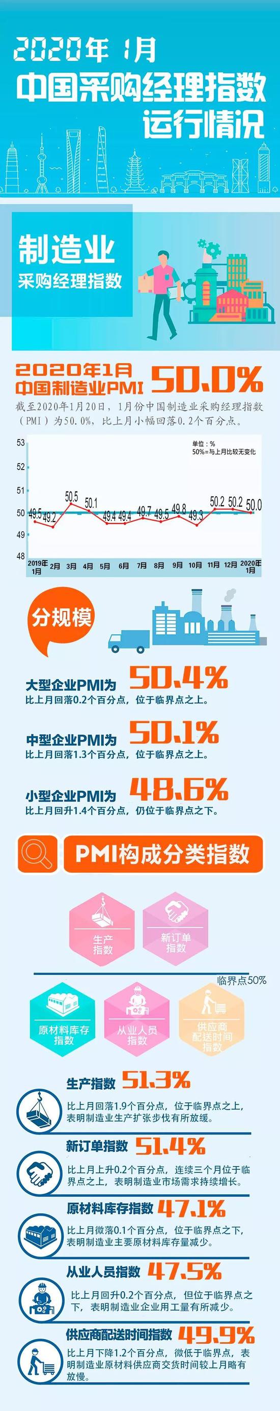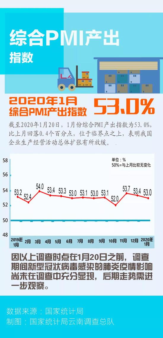 2020年1月经济数据相继出炉。1月制造业PMI为50.0%,非制造业商务活动指数为54.1%,综合PMI产出指数为53.0%。