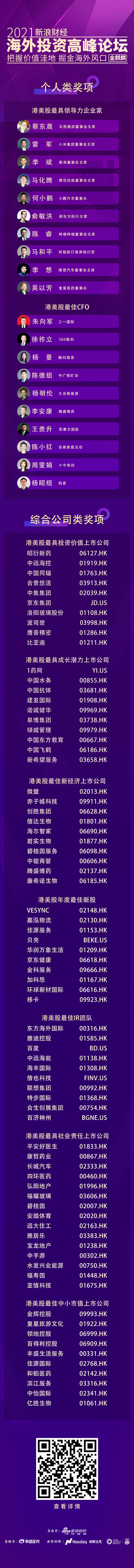 荣获2021新浪财经港美股最具领导力企业家的有: 石药集团董事会主席蔡东晨;小米集团董事会主席雷军;蔚来董事会主席李斌等。【详细】