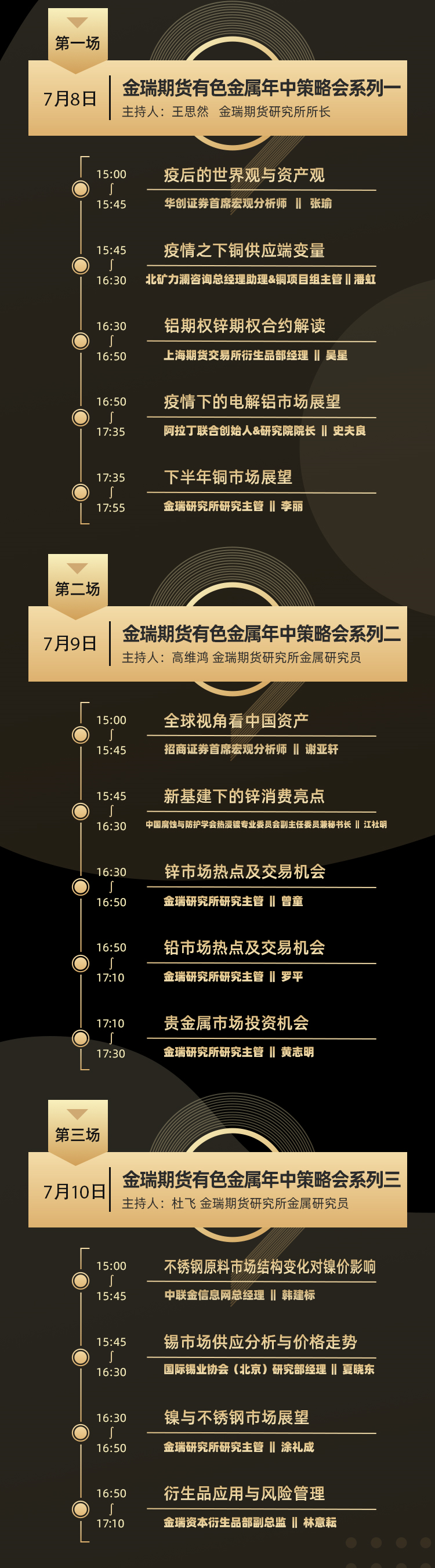 2020年新冠疫情对有色金属供需节奏造成冲击。展望下半年,如何从全球视角把握有色金属市场投资机会?供应端存在变量有哪些?如何看待新基建下消费亮点?有色金属下半年价格如何演绎?面对市场波动企业如何进行风险管理?本次线上会议特邀大型券商首席、各产业专家、行业研究员等众多嘉宾进行深度剖析。