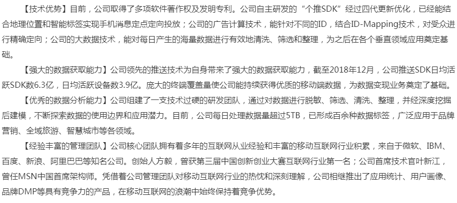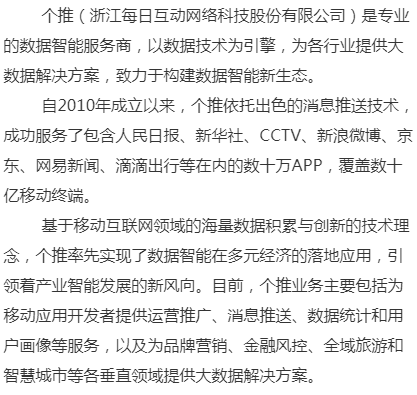 每日互动将在国内创业板上市,拟募集资金4.5亿元。每日互动是专业的数据智能服务商,以数据技术为引擎,为各行业提供大数据解决方案,致力于构建数据智能新生态。自2010年成立以来,个推已覆盖数十亿移动终端,基于移动互联网领域的海量数据积累与创新的技术理念,个推率先实现了数据智能在多元经济的落地应用,引领着产业智能发展的新风向。
