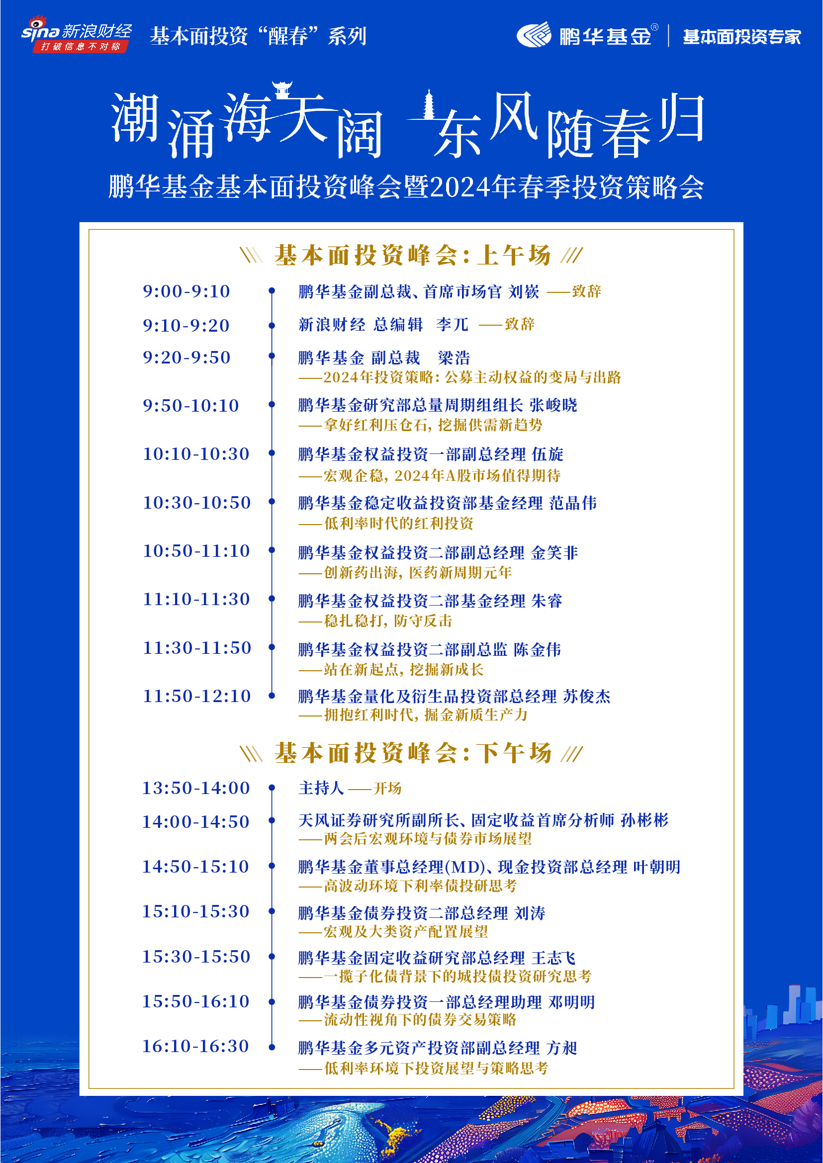 鹏华基金于3月22日在宁波举办第二届基本面投资峰会暨2024年春季投资策略会,以期能全面展现投研观点,传递基本面投资理念,打造与客户直接交流与沟通的平台。本届基本面投资峰会将落脚于推动经济高质量发展的背景,邀请知名券商首席分析师及鹏华基金基本面投资体系各领域专家,分别从权益、固收方向深入分析市场趋势、解读行业变化、展望市场黄金机遇,探讨2024年热点投资方向,与您共同感受基本面投资之美。