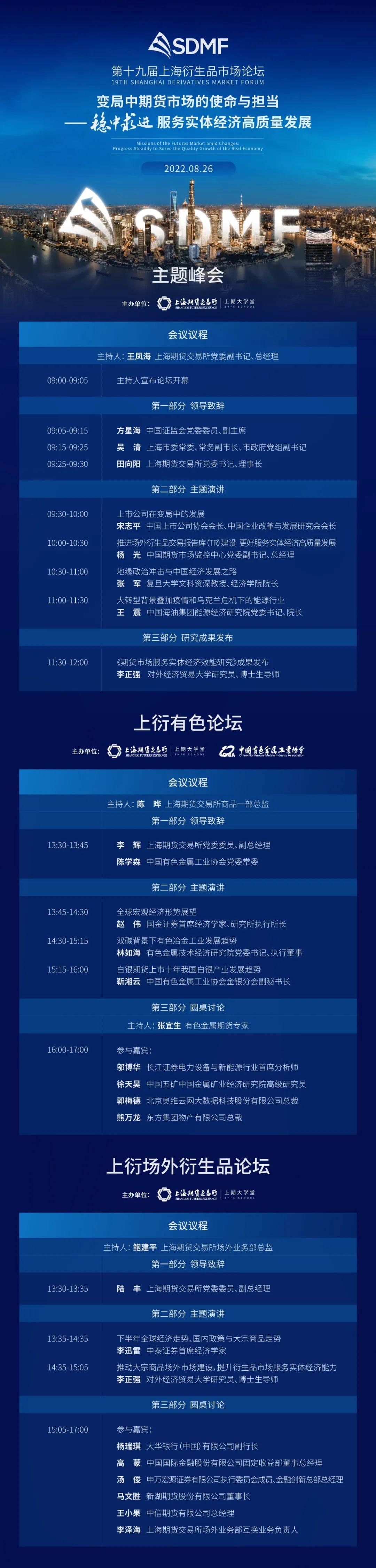 由上海期货交易所主办的“上海衍生品市场论坛”创办于2004年,迄今为止成功举办了18届,已成为国内期货行业一年一度的盛会,对于促进业内各界交流,共同推进期货市场响应国家战略,服务实体经济发挥了重要作用。当今世界百年未有之大变局加速演进,新一轮科技革命和产业变革迅猛发展。2022年,全球疫情反复、地缘政治冲突持续,大宗商品价格大幅波动,世界经济增速放缓,国内外环境更加错综复杂。在此背景下,第十九届上海衍生品市场论坛以“变局中期货市场的使命与担当——稳中求进,服务实体经济高质量发展”为主题,汇聚政府高层、权威专家学者以及知名行业专家,围绕大变局时代下的期货市场如何服务产业发展、提升重要大宗商品价格影响力等问题分享观点,建言献策。