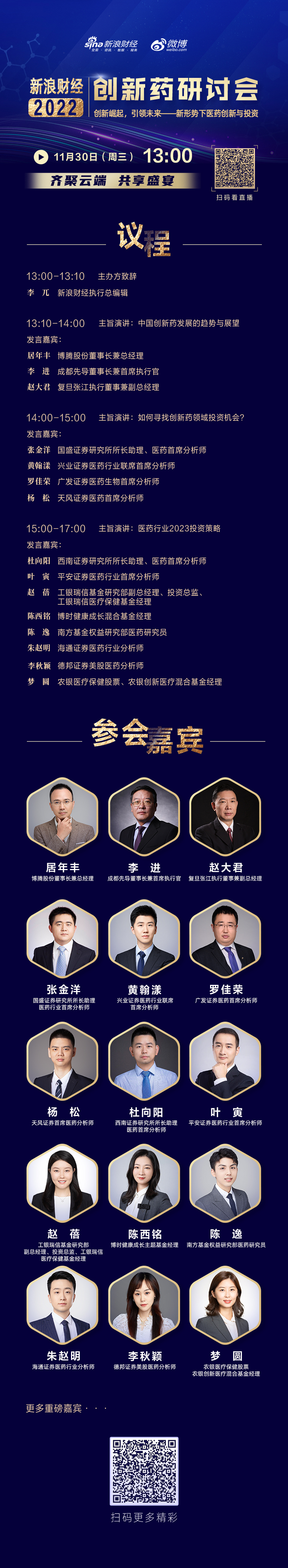 新浪财经执行总编辑李兀致辞。李兀表示,新浪财经愿意赋能中国创新药企业,在创新药公司与投资者之间架起一座沟通的桥梁,帮助创新药企业借势借力、整合资源,打造适合自己企业、富有竞争力的独特价值,实现品牌升级、公司价值提升。愿为广大投资者提供创新药行业的最新动态和投资机会。【详细】