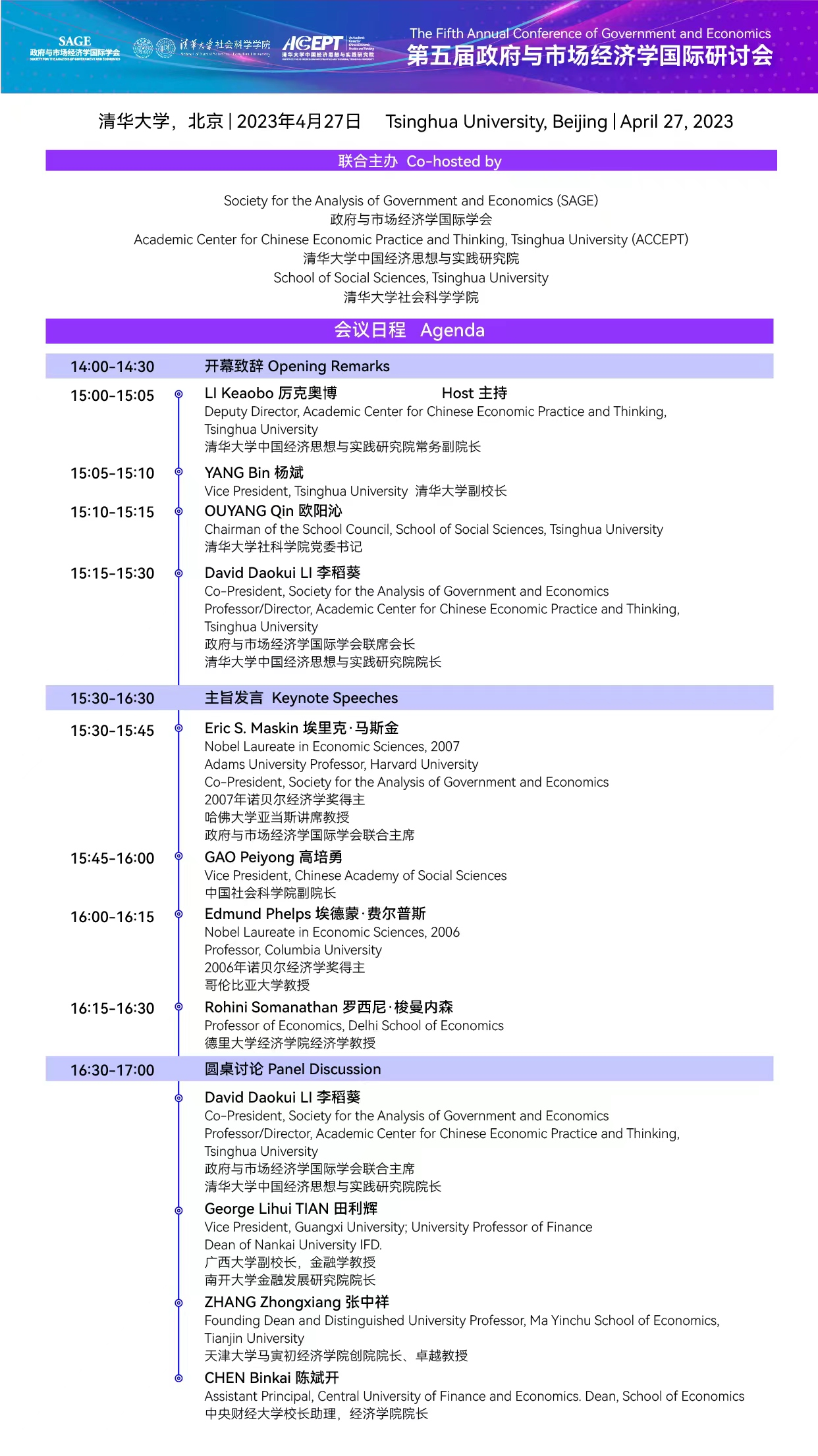 由清华大学中国经济思想与实践研究院和政府与市场经济学国际学会联合举办的第五届政府与市场经济学国际研讨会主论坛于2022 年4月27日举办。