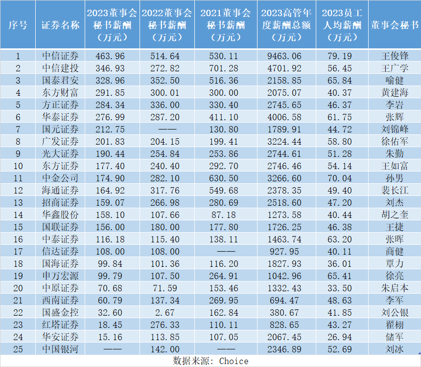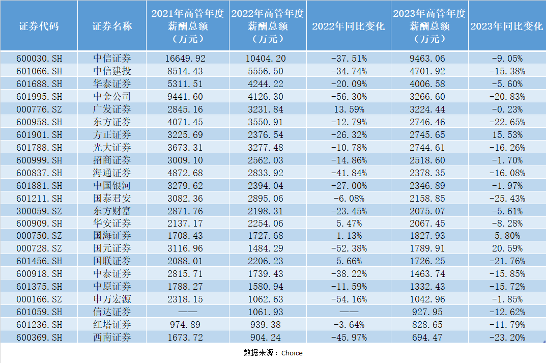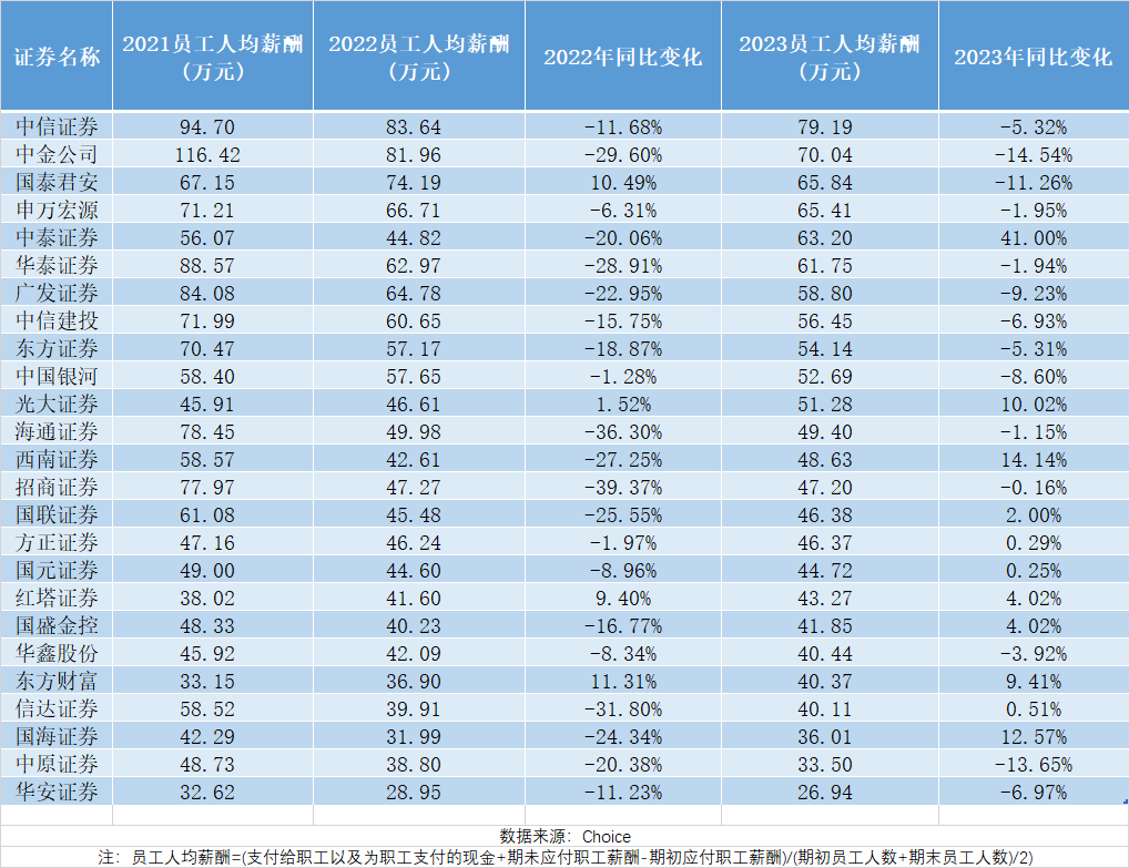 截至3月29日,已有22家上市券商披露了2023年年报。统计发现,60%的证券从业人员人均薪酬有所下滑。 中金公司从2021年的人均薪酬116万元降至人均70万元,两年间大幅“缩水”39.84%,降薪幅度为大券商中之最。除了中金公司外,2023年中原证券、国泰君安的员工人均薪酬也都减少10%以上。而从绝对规模来看,中信证券从2021年的人均薪酬95万元降至2023年的79万元,目前人均薪酬排在行业第一位。国泰君安、申万宏源、华泰证券、中泰证券的员工人均薪酬均在60万元以上。