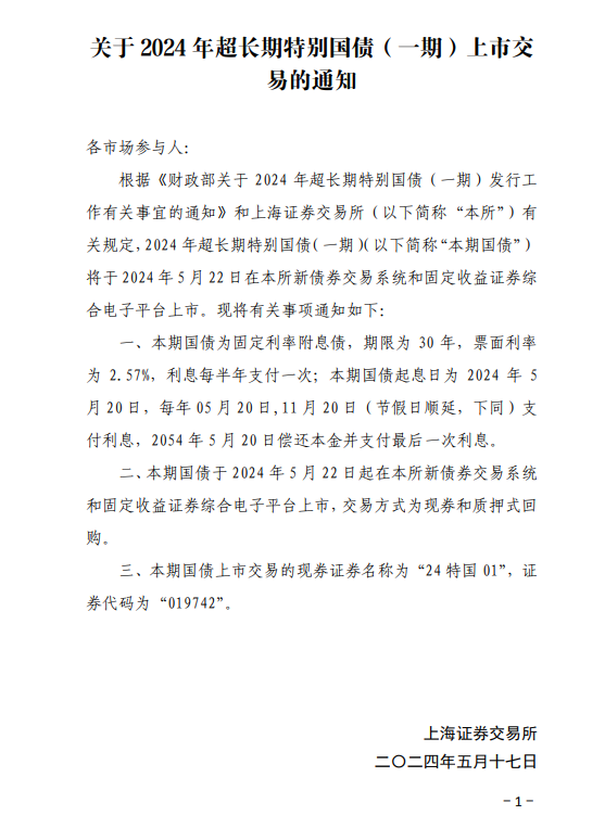 24特国01(代码:019742)涨25%,盘中第二次临停,将自15时27分起恢复交易。据财政部此前通知,5月17日首发的30年期超长期特别国债,于今日(5月22日)起在二级市场上市交易。上市后,个人投资者可在二级市场向机构投资者购买。