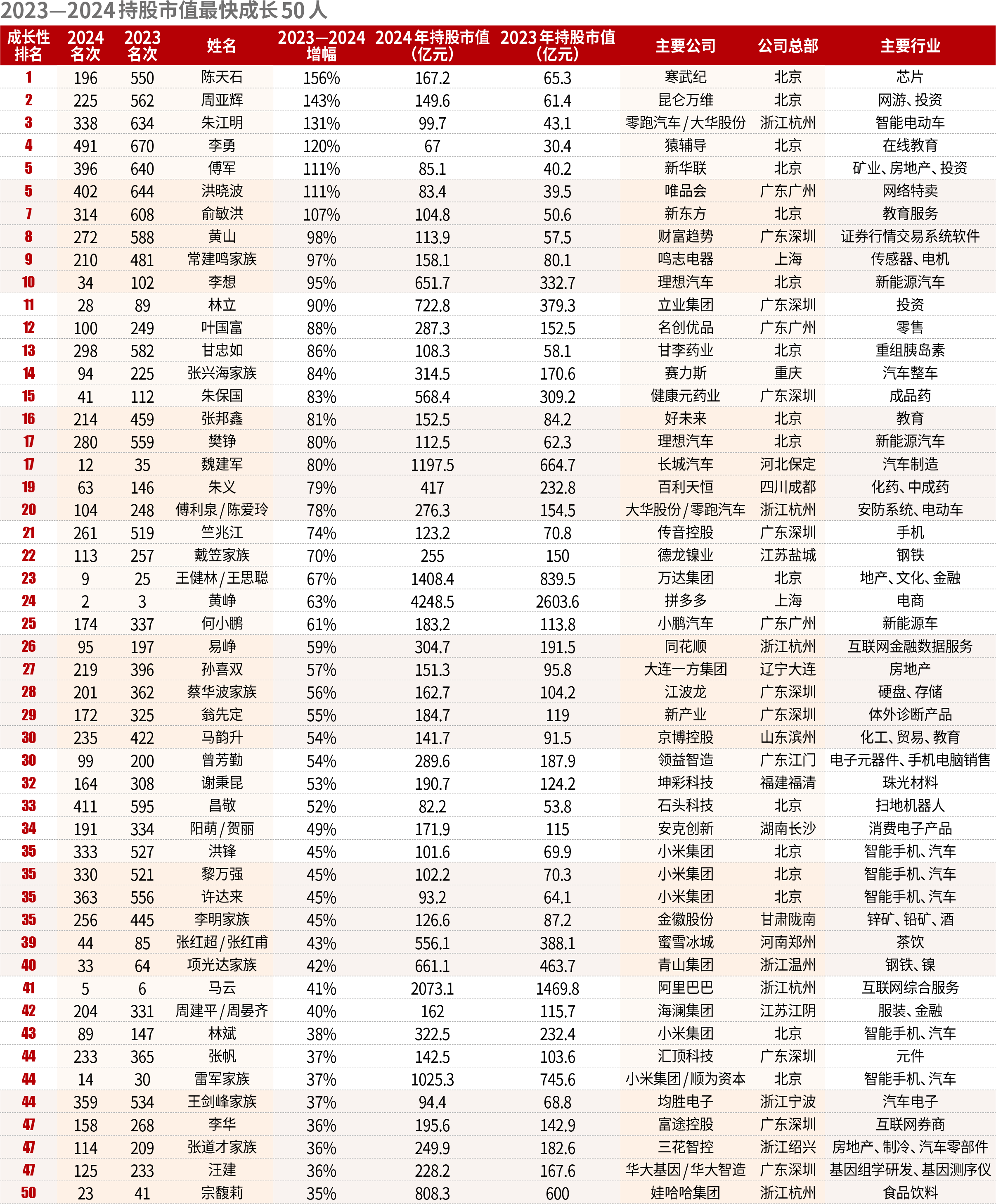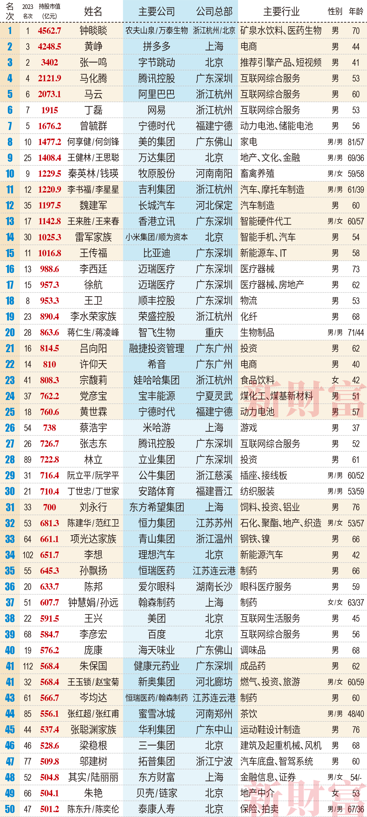 今年,钟睒睒以4562.7亿元持股市值,第四度蝉联新财富500创富榜榜首。同为80后的黄峥、张一鸣分列榜眼、探花,持股市值则已从5年前的700亿元量级,分别跃至4248亿元、3402亿元。王健林父子总身家达1406亿元,回到前十。