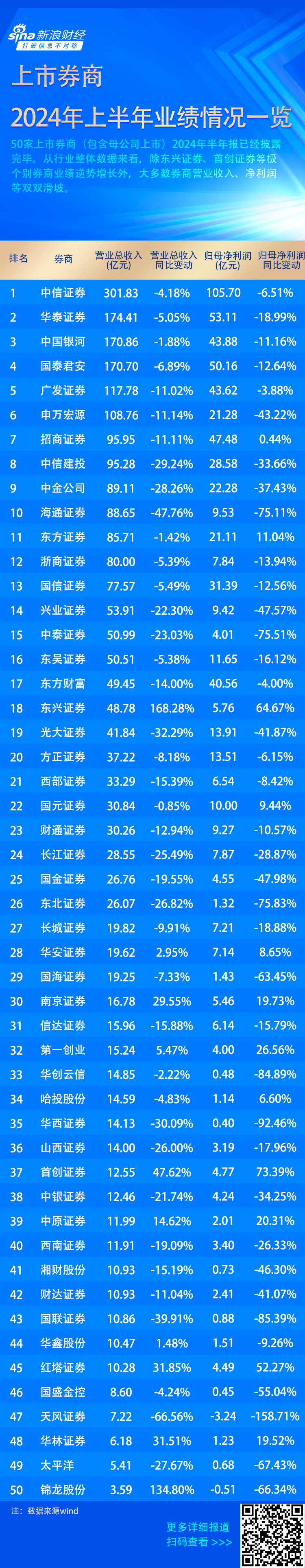 24家上市券商披露半年报:15家净利润下滑,3家营收增长翻番
