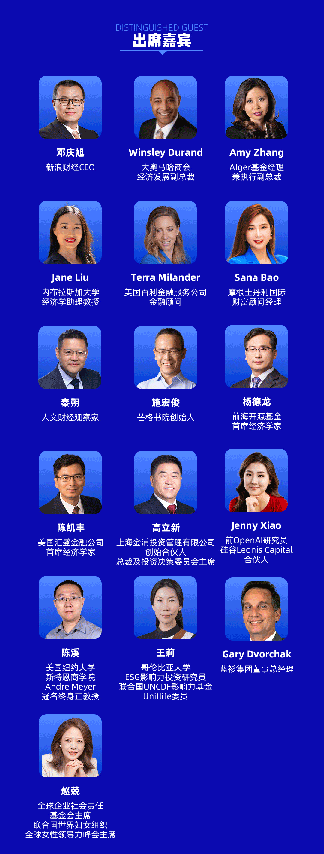 | 17:05-19:00 | 主题分享:全球投资方向及趋势 | 陈溪 美国纽约大学斯特恩商学院 Andre Meyer 冠名终身正教授; 高立新 上海金浦投资管理有限管创始合伙人、总裁及投资决策委员会主席; Jenny Xiao 前OpenAI研究员 硅谷Leonis Capital合伙人; 王莉 哥伦比亚大学ESG影响力投资研究员、联合国UNCDF影响力基金Unitlife委员;陈凯丰 美国汇盛金融公司首席经济学家 |