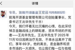 11月10日,前海开源基金发布讣告,公司创始人暨首任董事长王兆华同志因病医治无效,于2025年11月10日在西安逝世。公开资料显示,王兆华出生于1957年8月,陕西乾县人。他于1980年进入金融系统,从中国人民银行西安市分行起步,在超过四十年的职业生涯中,历任中国工商银行、华夏证券、开源证券等多家金融机构主要领导职务,以其卓越的专业能力与战略胆识,为中国资本市场发展作出重要贡献。前海开源基金在讣告中表示,王兆华同志的离世是公司的巨大损失,其精神风范将长存于心,公司上下将化悲痛为力量,继续前行。