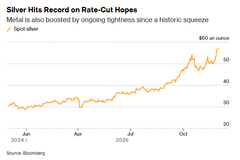 12月1日亚洲交易时段,伦敦现货白银价格再创历史新高,盘中首次突破每盎司57美元,截至北京时间上午10点,伦敦现货银价报每盎司57.7美元,涨幅约2.3%。今年以来,国际银价已上涨超90%,大幅跑赢黄金。