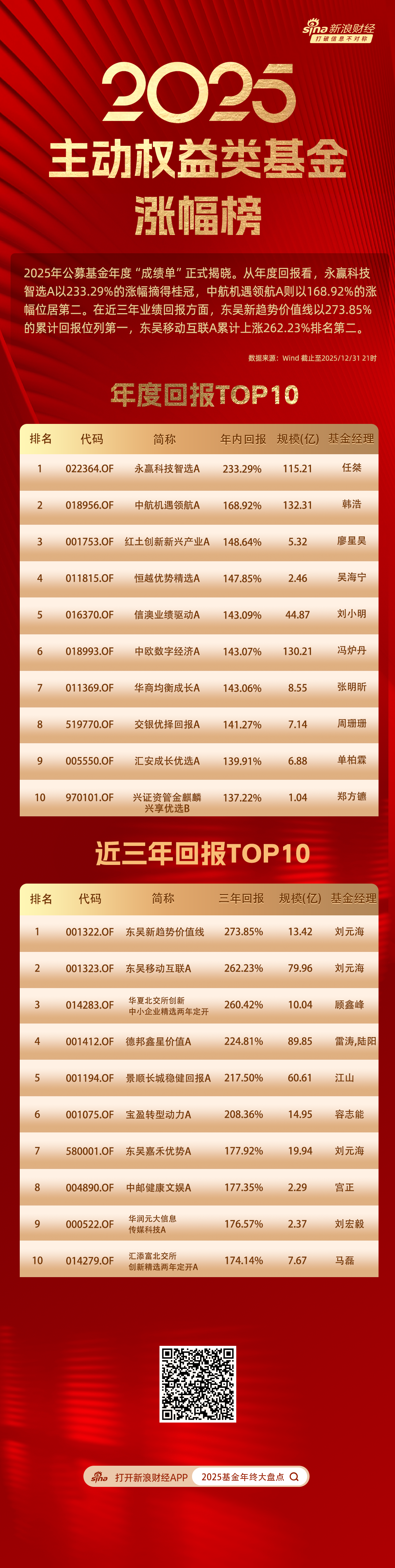 主动权益基金年度榜单揭晓:永赢科技智选A以年度回报233.29%折桂,东吴新趋势价值线三年回报274%问鼎
