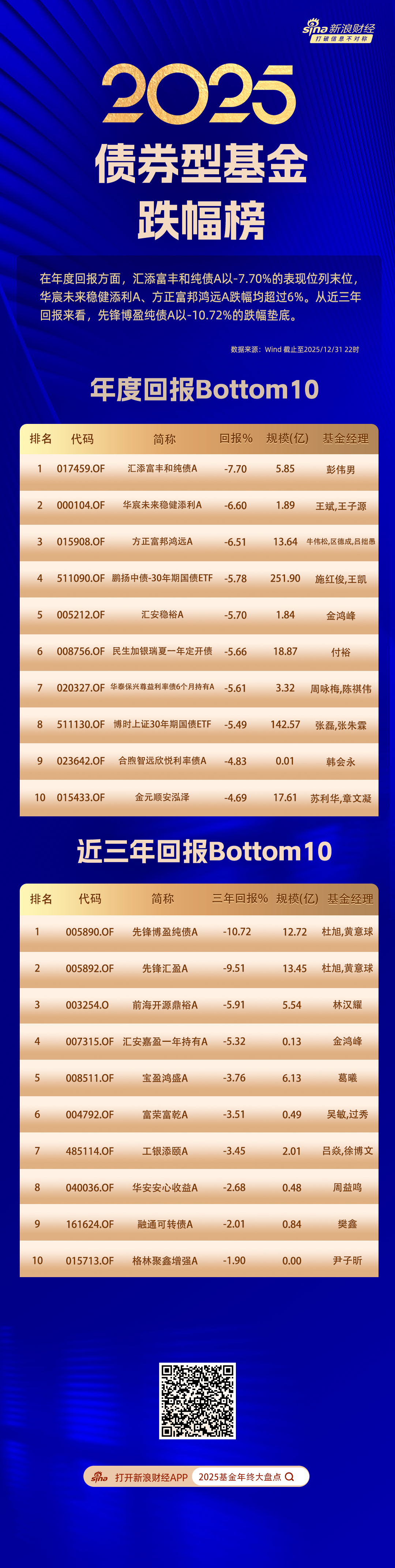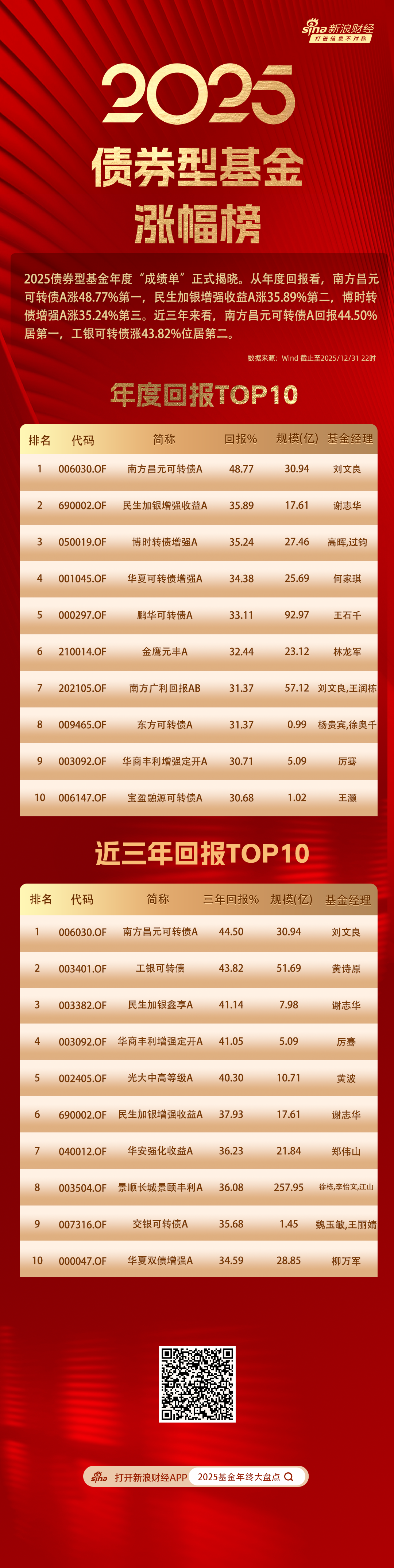 债券基金2025年度榜单揭晓:南方昌元可转债A以回报48.7%夺冠,汇添富丰和纯债亏7.7%垫底