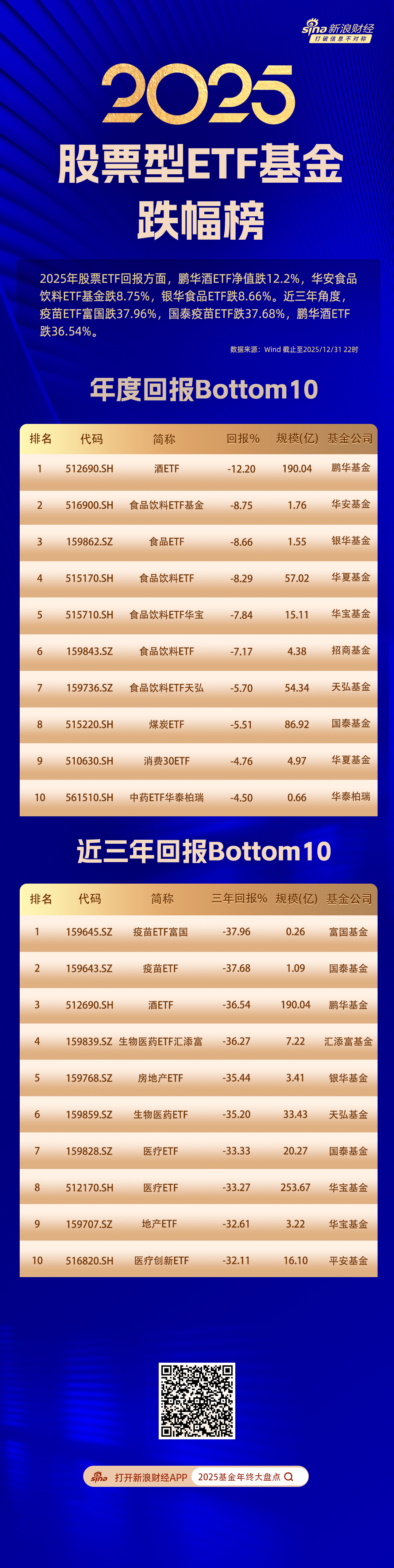 2025股票ETF跌幅榜:鹏华酒ETF跌12.2%,华安食品饮料ETF跌8.75%,银华食品ETF跌8.66%(名单)