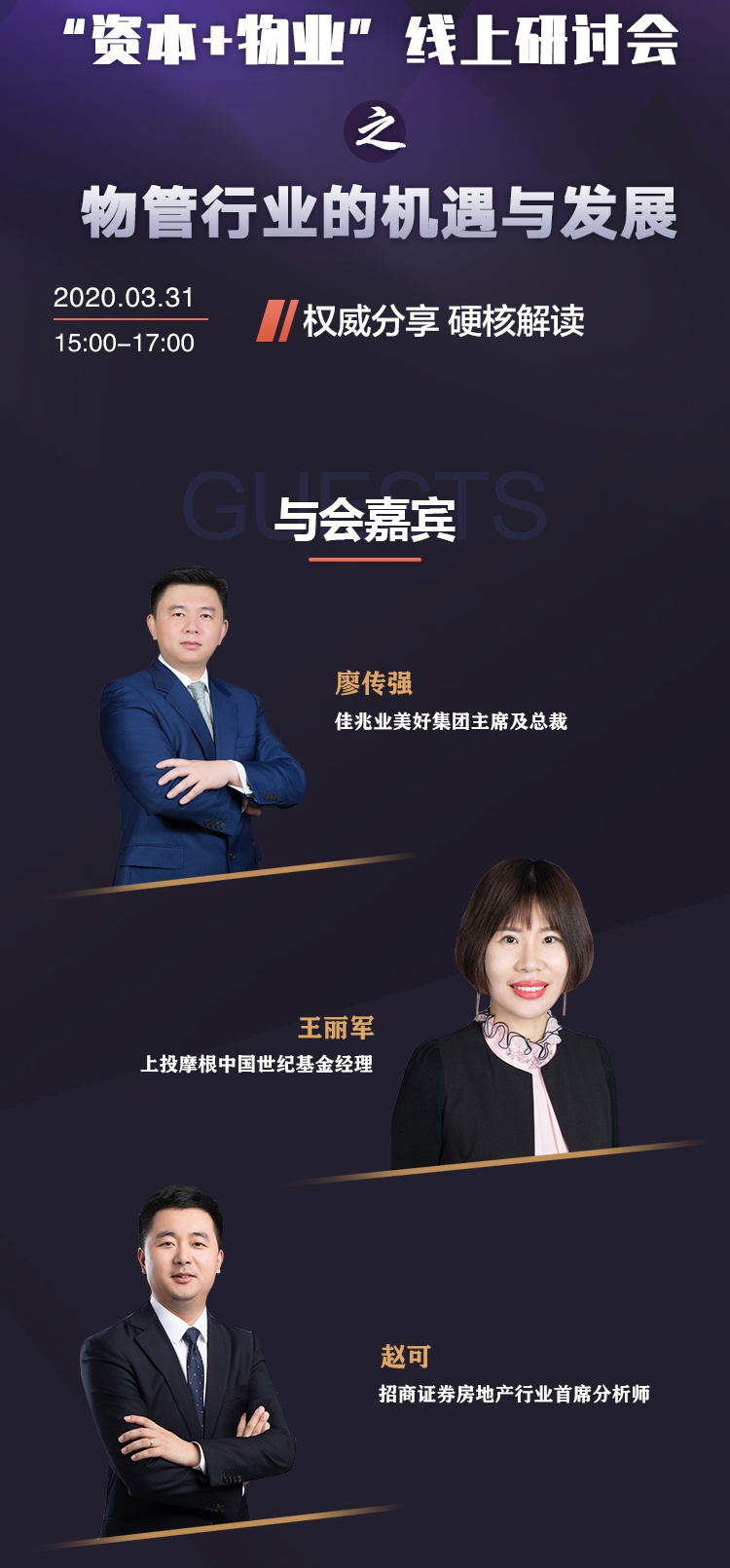 物业公司分拆上市大潮中,资本市场对于行业的高成长给予了高估值。物业股走强的核心逻辑是什么,疫情之下物业公司股价波动加大,是否迎来布局良机?3月31日,新浪财经上市公司研究院特别策划“物管行业机遇与发展”研讨会,佳兆业美好董事会主席及总裁廖传强、上投摩根中国世纪基金经理王丽军、招商证券房地产行业首席分析师赵可将进行线上分享,解读疫情之下物业管理行业的机遇与发展。
