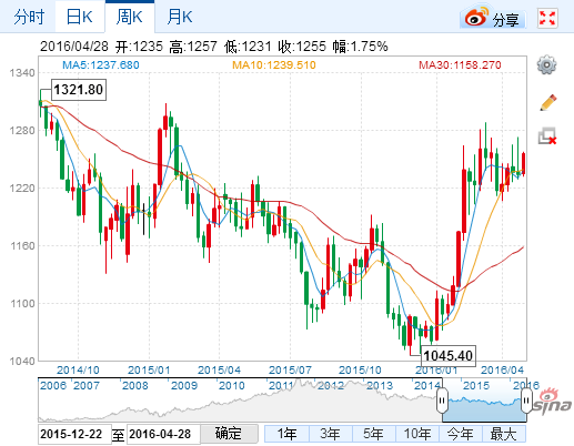 黄金作为一种大周期投资产品,一旦上涨趋势形成,时间或将长达几年。今年以来国际现货黄金涨幅约16%,收于1257美元(截止到2016年4月28日),未来全球范围内的通胀预期,和国际地缘政治因素导致的避险情绪,将持续推动黄金的上涨。另外,美国股市的回调,和中国股市低迷,使得黄金投资更受追捧。美元指数短线急剧下行暴跌之际,黄金市场再现“20亿美元”奇观。股市萎靡,黄金表现亮眼,此时正是投资黄金的好时机! |
